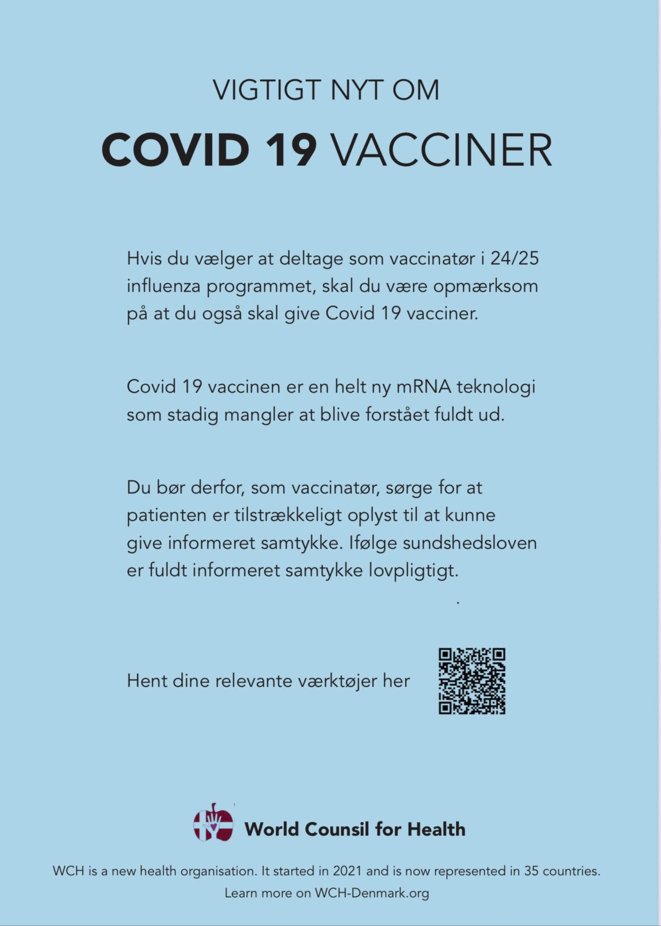 ![VIGTIGT NYT OM COVID 19 VACCINER. Hvis du vælger at deltage som vaccinatør i 24/25 influenza programmet, skal du være opmærksom på at du også skal give Covid 19 vacciner. Covid 19 vaccinen er en helt ny mRNA teknologi som stadig mangler at blive forstået fuldt ud. Du bør derfor, som vaccinatør, sørge for at patienten er tilstrækkeligt oplyst til at kunne give informeret samtykke. Ifølge sundhedsloven er fuldt informeret samtykke lovpligtigt. Hent dine relevante værktøjer her [QR-kode]. World Counsil for Health](https://usercontent.one/wp/www.detsovendefaar.dk/wp-content/uploads/2024/10/World-Council-for-Unhealthiness-3-731x1024.jpg?media=1761897458)