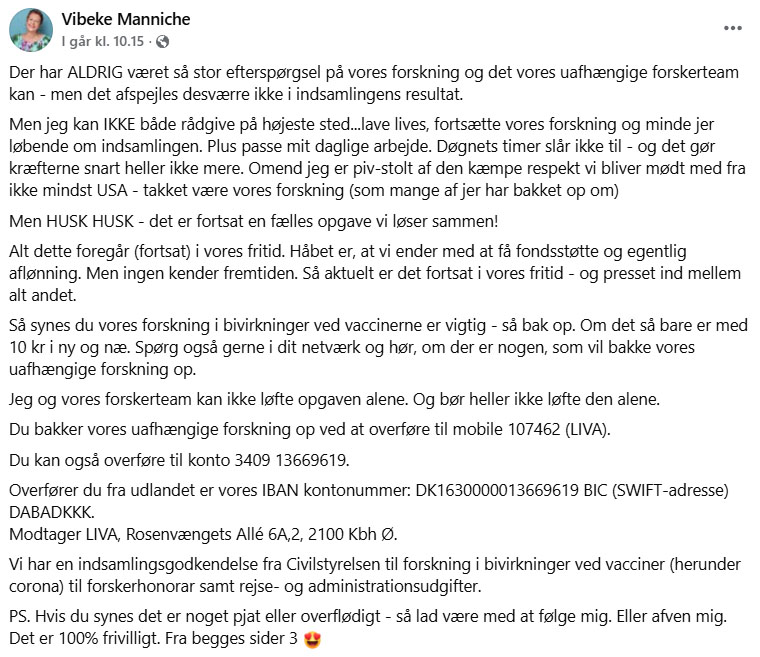![Vibeke Manniche den 16. oktober 2025: Der har ALDRIG været så stor efterspørgsel på vores forskning og det vores uafhængige forskerteam kan - men det afspejles desværre ikke i indsamlingens resultat. Men jeg kan IKKE både rådgive på højeste sted...lave lives, fortsætte vores forskning og minde jer løbende om indsamlingen. Plus passe mit daglige arbejde. Døgnets timer slår ikke til - og det gør kræfterne snart heller ikke mere. Omend jeg er piv-stolt af den kæmpe respekt vi bliver mødt med fra ikke mindst USA - takket være vores forskning (som mange af jer har bakket op om) Men HUSK HUSK - det er fortsat en fælles opgave vi løser sammen! Alt dette foregår (fortsat) i vores fritid. Håbet er, at vi ender med at få fondsstøtte og egentlig aflønning. Men ingen kender fremtiden. Så aktuelt er det fortsat i vores fritid - og presset ind mellem alt andet. Så synes du vores forskning i bivirkninger ved vaccinerne er vigtig - så bak op. Om det så bare er med 10 kr i ny og næ. Spørg også gerne i dit netværk og hør, om der er nogen, som vil bakke vores uafhængige forskning op. Jeg og vores forskerteam kan ikke løfte opgaven alene. Og bør heller ikke løfte den alene. Du bakker vores uafhængige forskning op ved at overføre til mobile 107462 (LIVA). Du kan også overføre til konto 3409 13669619. Overfører du fra udlandet er vores IBAN kontonummer: DK1630000013669619 BIC (SWIFT-adresse) DABADKKK. Modtager LIVA, Rosenvængets Allé 6A,2, 2100 Kbh Ø. Vi har en indsamlingsgodkendelse fra Civilstyrelsen til forskning i bivirkninger ved vacciner (herunder corona) til forskerhonorar samt rejse- og administrationsudgifter. PS. Hvis du synes det er noget pjat eller overflødigt - så lad være med at følge mig. Eller afven mig. Det er 100% frivilligt. Fra begges sider 3 [hjerter i øjnene-emoji]](https://usercontent.one/wp/www.detsovendefaar.dk/wp-content/uploads/2025/10/Dagligt-arbejde-1.jpg?media=1767203053)